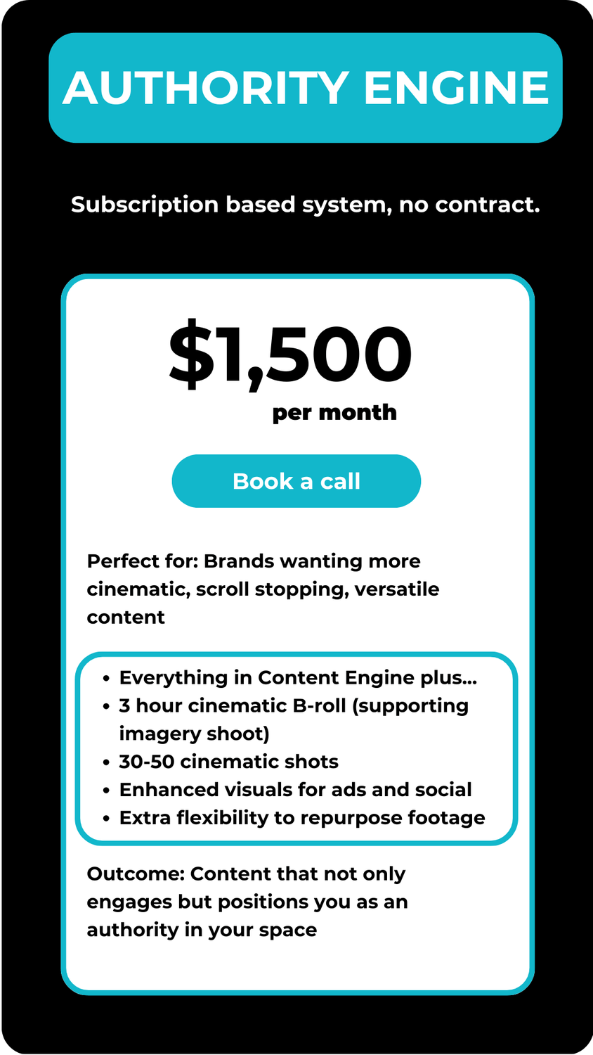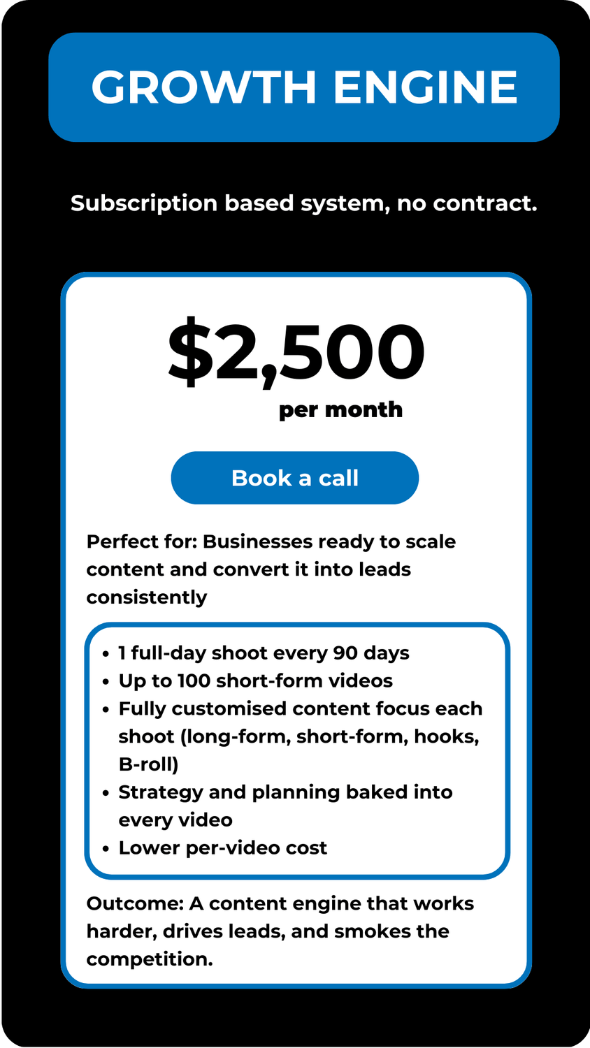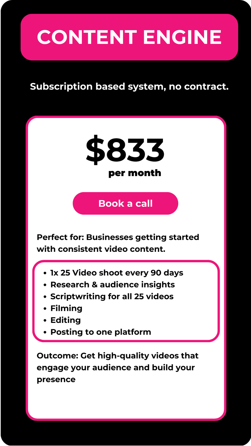 Upgrade, downgrade or cancel at the end of every 3 month cycle. You may start with content engine to dip your toes into content, then discover you really need B-roll, so upgrade to Authority Engine the next quarter. You may start with Growth engine and then have pressing priorities on systems and processes, so need ot downgrade to Content Engine. Or you may be a sole trader and just want to try this "content thing" if it's not for you there are no contracts, cancel at the end of any 3 month cycle. We are 25 videos for $2,500 and if thats all you want, we've got you covered.